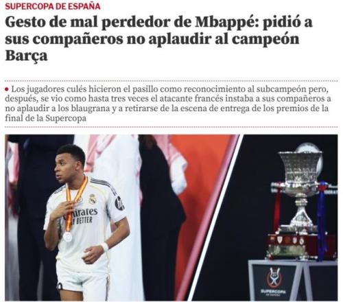 巴萨3-2皇马实现卫冕。赛后,据《世界体育报》的报道称,姆巴佩在赛后做出了一些不太友好的举动。